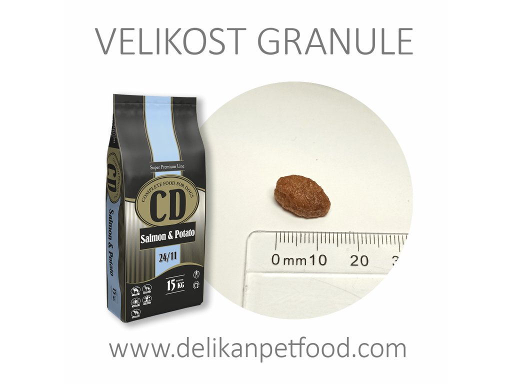 Jedná se o krmivo vhodné pro všechny kategorie dospělých psů i pro psy obézní případně psy v rekonvalescenci. Složka bílkovin je zabezpečena lososovou rybí surovinou a glycidová složka bramborovým škrobem. Nenasycen mastné kyseliny (Omega 3 a Omega 6) jsou ve vyváženém poměru. Obsah makro i mikroprvků plně pokrývá potřebu dospělého psa. Množství a podíl vitaminů plně zabezpečuje potřebné množství. Vyšší obsah vitamínu C podporuje tvorbu biosyntézy kolagenu. Tím je zabezpečena správná regenerace kostní a chrupavkové tkáně, včetně dobrého hojení ran. Společně s vitamínem C přispívá ke zvýšené odolnosti a zlepšenému imunitnímu systému podíl obsažených probiotik, které upravují pozitivně střevní mikroflóru. V krmivu jsou navíc protilátky IGY vázané na vaječnou hmotu, které blokují nežádoucí množení a následnou distribuci v organismu psů řady patogenních virů (parvovirus, rota a corona virus) a dalších potenciálně nebezpečných bakterii.